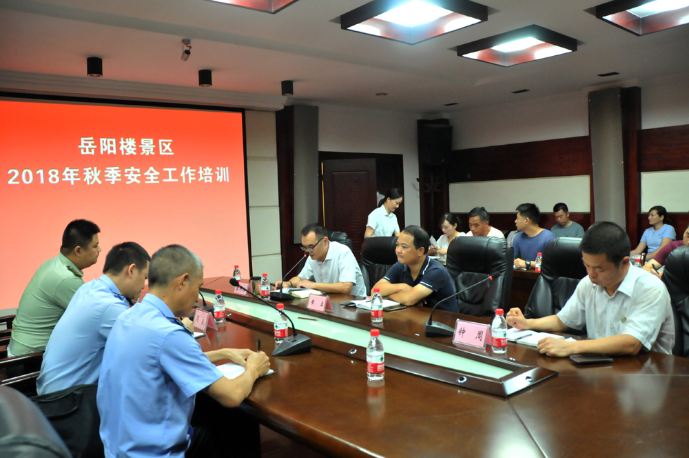 根据岳阳楼景区管委会安全培训年度计划安排,8月9日上午,岳阳楼景区开展2018年度秋季安全专题培训,邀请岳阳市消防支队参谋何俊彦、岳阳楼派出所教导员周良来景区进行消防安全和防恐防暴知识培训,岳阳市旅游和外事侨务发展委员会副主任、主持岳阳楼景区全面工作的黄立同志参加会议并讲话。